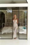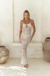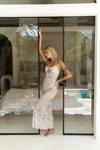 İnce askılı, yuvarlak yaka uzun elbise. Göğüs kısmı cut-out pencere detaylı, desenli ve dökümlü kumaştan tasarlanmıştır. Astarsızdır.