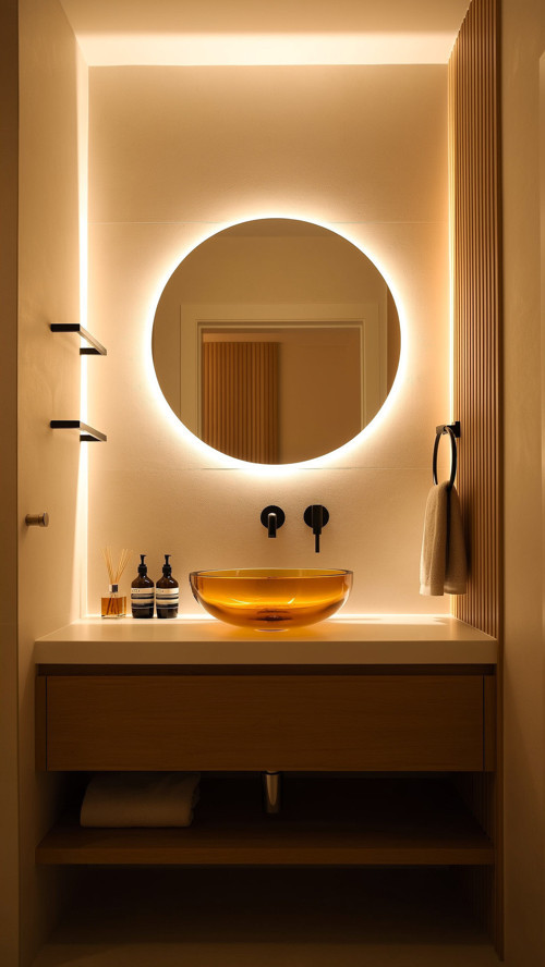 - Türkiye menşeli, yüksek kaliteli cam malzemeden üretilmiş yuvarlak ışıklı banyo ayna.
