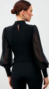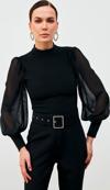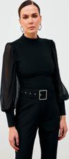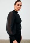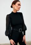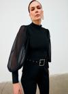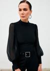 Dik yaka, tam kalıp, geniş manşetli şifon kol bluz.