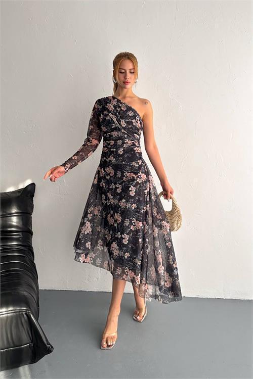 Dip Moda kadın desenli asimetrik tül elbise DPK4161