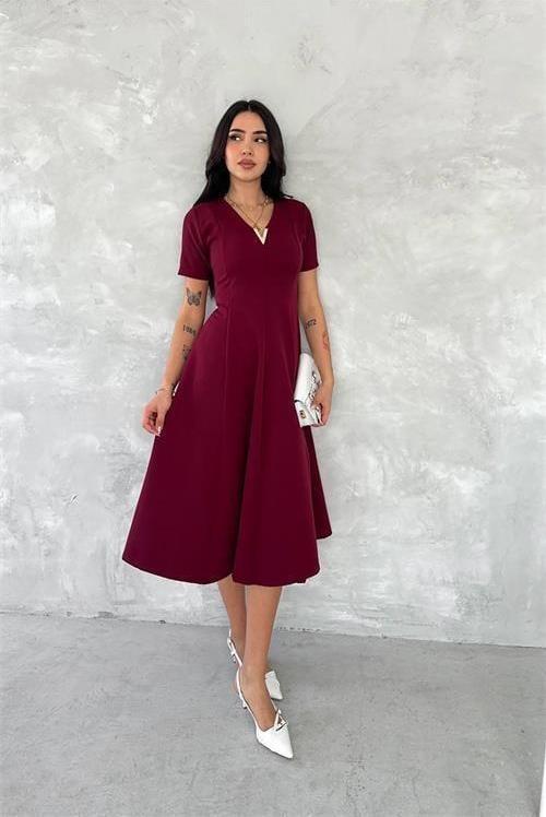Ürün Adı: Dipmoda kadın esnek V-yaka midi boy astarsız elbise DPK4179