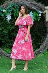 kadın fuşya bağlama detaylı madonna yaka şifon elbise DP100371