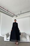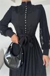 Ürün 36-42 bedene kadar uyumludur, dantel detaylı, düğmeli, hakim yaka, maxi boy, astarlı, tasarım elbise