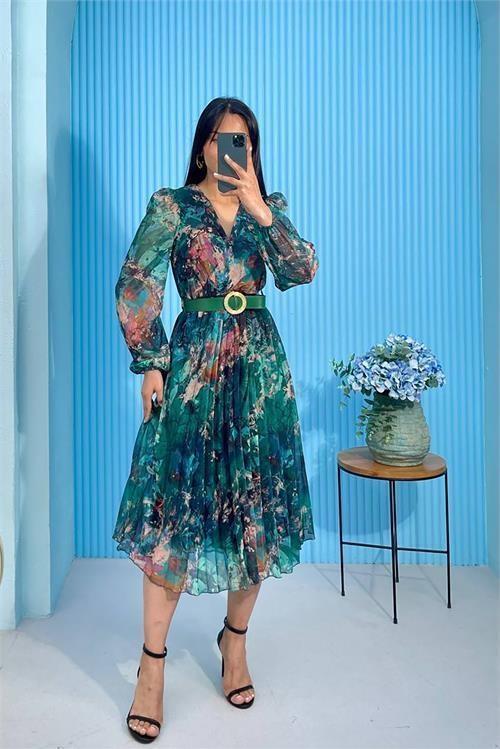 Ürün Adı:Dipmoda kadın kemerli çiçek desenli şifon elbise DPMY3286