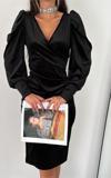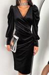 Ürün Adı: Dipmoda kadın kruvaze yaka büzgülü kadife elbise KKLF68 - Siyah
