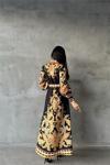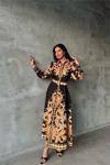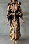 Ürün 36-42 bedene kadar uyumludur, kemerli, hakim yaka, iç göstermez, maxi boy, uzun kol, desenli, düğme detaylı, yeni sezon, astarsız.