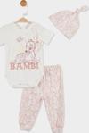 Ürün Özellikleri: Yandan çıtçıtlı bisiklet yaka, kısa kol, baskılı çıtçıtlı bady, beli lastikli, metraj baskılı, manşetli pantolon ve metraj baskılı şapka 3'lü takım