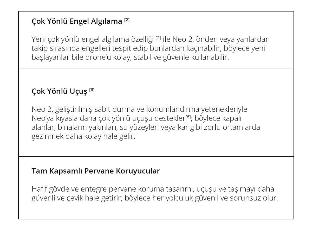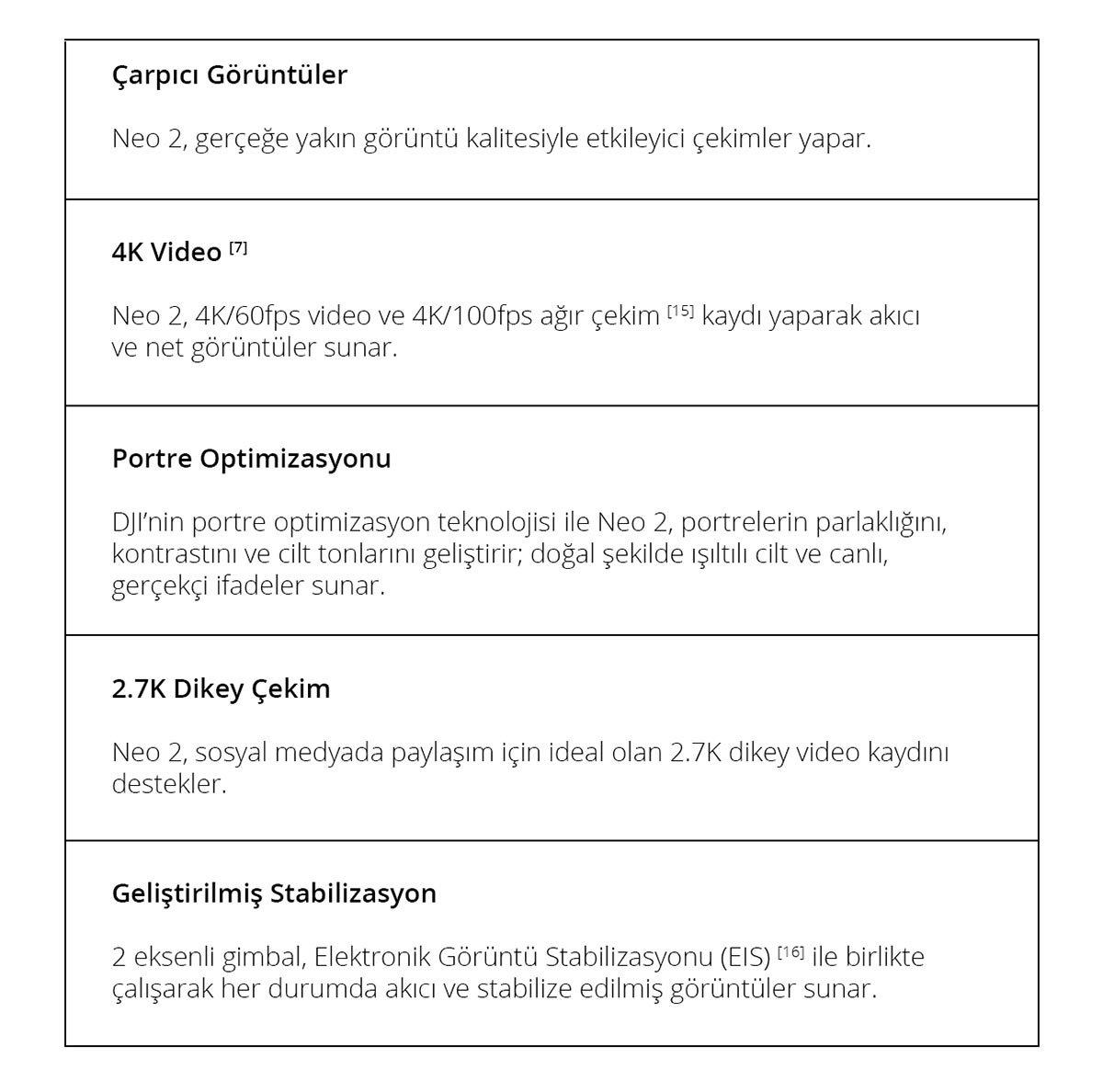 ** Tüm veriler, kontrollü bir ortamda üretim modeli DJI Neo 2 kullanılarak test edilmiştir. Gerçek deneyim, ortam, kullanım ve yazılım sürümüne bağlı olarak değişiklik gösterebilir.