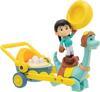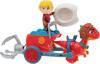 Dinozor figürlerinin tekerlekli ayak tasarımları ile çocuklar dinozorları hareket ettirirken araçları da birlikte sürüyorlar.