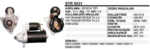 Dodo markasının sunduğu bu marş motoru, Volkswagen Transporter 2.4 ve 2.5 modelleri için özel olarak tasarlanmıştır.