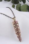 Mat pembe renk rodonit taşından el işçiliği altın kaplama tel örme kolye. Su ve kimyasal maddelerden uzak tutularak kararma yapmaz. Kolye ucu ortalama 4-6X1 CM boyutlarındandır.