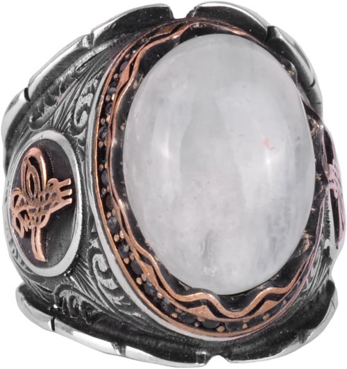 Kambo Doğal Cabochon Akuamarin Taş Yüzük, Osmanlı İmparatorluğu Tuğra Gümüş Yüzük, Huzur Temalı 925K Katı Gümüş Erkek Yüzük