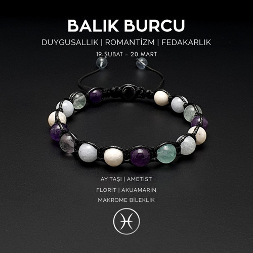 Balık burcunun ruhsal, sezgisel ve romantik doğasından ilham alınarak hazırlanan bu el yapımı makrome bileklik; ay taşı, ametist, florit ve akuamarin taşlarının zarif birleşimiyle öne çıkıyor.