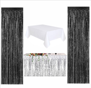 4 PARÇA BEYAZ MASA ÖRTÜSÜ, GÜMÜŞ MASA ETEĞİ, 2 ADET SİYAH ARKA FON