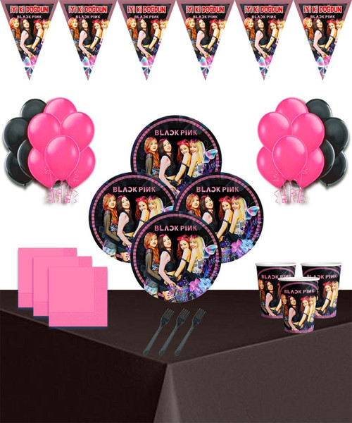 set içeriği 8 adet blackpink tabak 8 adet blackpink bardak 8 adet pembe peçete 8 adet siyah çatal 10 adet siyah pembe balon 1 adet siyah masa örtüsü 1 adet blackpink flama