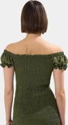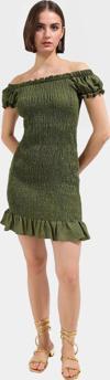 Yazın enerjisini yansıtan bu haki mini elbise ile göz kamaştırın! Vücudu saran kesimi ve şık tasarımıyla tüm bakışları üzerinize çekeceksiniz. 85% viskoz ve 15% poliamid karışımından üretilen, yüksek kaliteli ve nefes alabilen dokuma kumaşı gün boyu konfor sunuyor. Balon kolları, elbiseye zarif bir dokunuş katarken, Aerobin dokuma tekniği ile üretilen kumaşı, hem şık hem de dayanıklı bir yapı oluşturuyor. Bu elbise ile hem gündüz aktivitelerinizde hem de gece dışarı çıkarken kendinizi harika hissedeceksiniz.