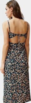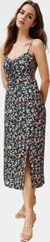 Yüksek kaliteli viskoz kumaş, yumuşak dokusuyla teninizde harika bir his bırakır. A-line kalıbı her vücut tipine uyum sağlayarak kusursuz bir görünüm oluşturur. Çiçekli desen, elbiseye romantik bir hava katarken, lacivert rengi şıklığıyla göz kamaştırır. Kolsuz ve astarsız tasarımıyla sıcak havalarda serin ve rahat kalmanızı sağlar. Cut out ve volan detayları ise elbiseye hareketlilik ve feminen bir dokunuş katar.