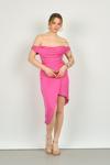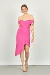 Detay: Sentetik, degaje yaka, asimetrik kesim, belden toplamalı, tokalı, astarlı abiye elbise;