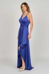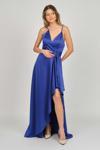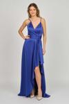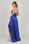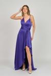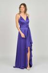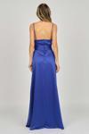Detay: İp askılı, yandan toplamalı, saten, astarlı abiye elbise;