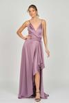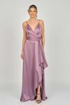 Detay: İp askılı, yandan toplamalı, saten, astarlı abiye elbise;