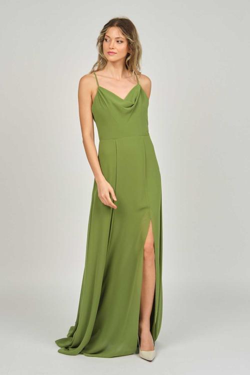 Detay: Şifon, derin yırtmaçlı, degaje yaka, sırt detaylı, astarlı abiye elbise;