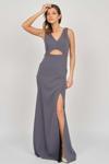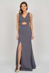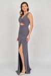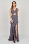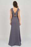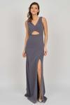 Detay: Ön-arka dekolte detaylı, derin yırtmaçlı, uzun abiye elbise;