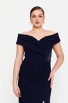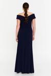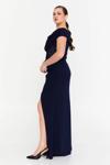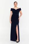 Detay: Ön-arka dekolte detaylı, derin yırtmaçlı, uzun abiye elbise;