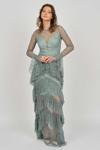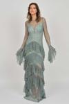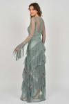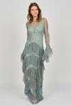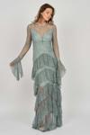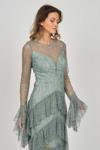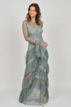 Detay: Kol ve basen altı kat kat fırfırlı, uzun abiye elbise;