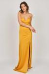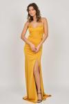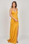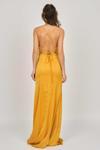 Detay: Derin yırtmaçlı, arka kısmı dekolte, uzun abiye elbise;