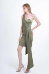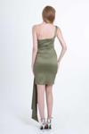 Detay: Tek omuz, saten, astarlı abiye elbise;