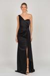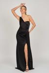 Detay: Tek omuz, derin yırtmaçlı, astarlı abiye elbise;