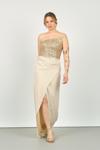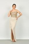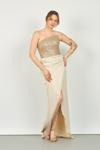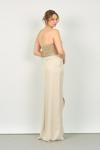 Detay: Derin yırtmaçlı, uzun, astarlı abiye elbise;