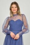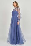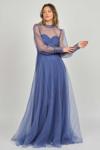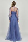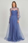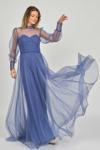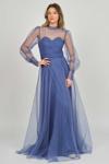 Detay: uzun kollu, kloş, astarlı abiye elbise;