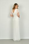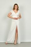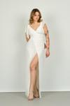 Detay: Kollar volanlı, kruvaze, yırtmaçlı astarlı abiye elbise;