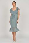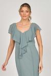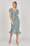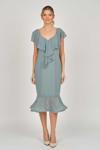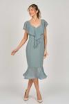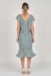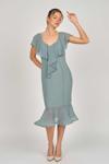Detay: Beş köşe yaka, volanlı, astarlı abiye elbise;