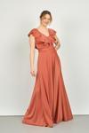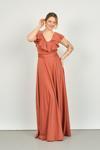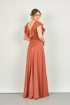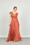 Detay: Saten, ön-arka V yaka, belden aşağı kloş uzun abiye elbise;