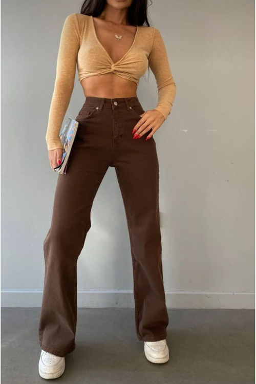 Kahverengi tonuyla her mevsime uygun bir seçenek olan bu jean pantolon, farklı kombinlerle kolayca uyum sağlar.