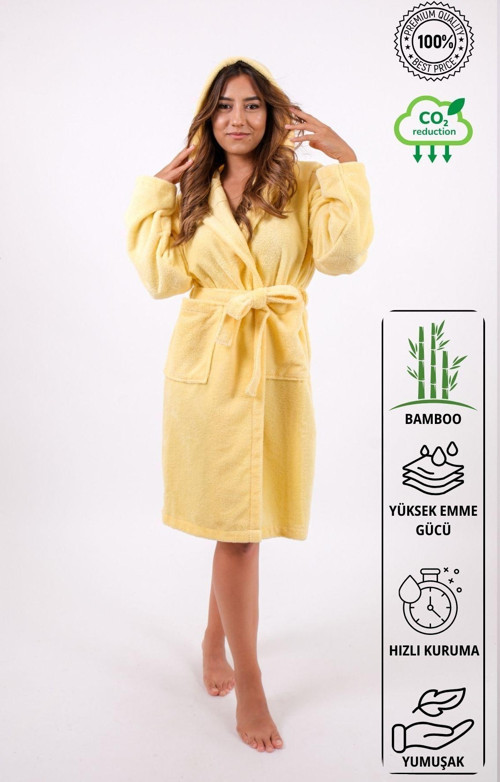 Bambu ipliğinden üretilmiş bu bornoz, yüksek su çekme kapasitesi sayesinde banyo sonrasında üstün rahatlık sunar.