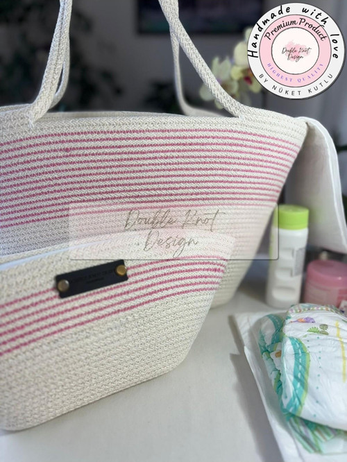 Double Knot Design Baby 2Li Takım Bebek Bakım Çantası,El Çantası Clutch Kadın Çanta,Hediyelik, Hasır Tres