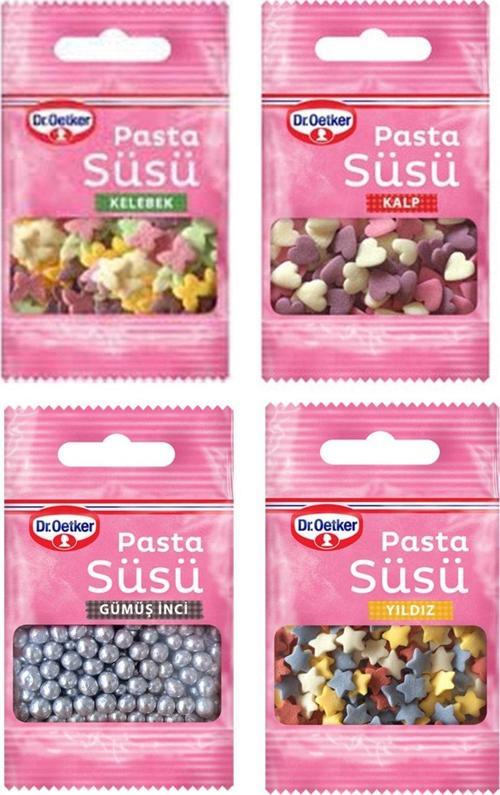 Dr Oetker dekor serisi pasta süsü 4 adet 10 gramlık farklı çeşitte ürün. 1'er paket