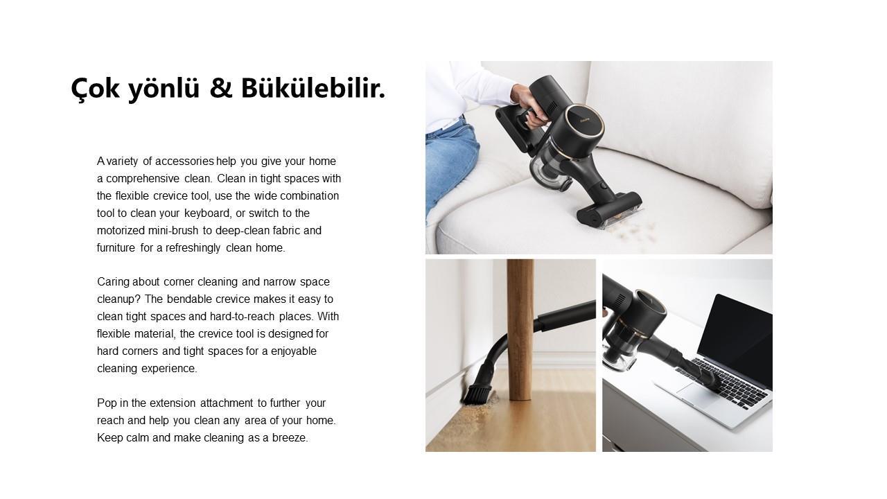 Dreame R10 Pro, temizlik görevleri boyunca yüksek emiş gücünü koruyan, yüksek hızlı fırçasız motora sahiptir. LED aydınlatması, değiştirilebilir fırça başlıkları ve 150 AW etkileyici emiş gücü ile kapsamlı temizliği sizin için kolay hale getirir.