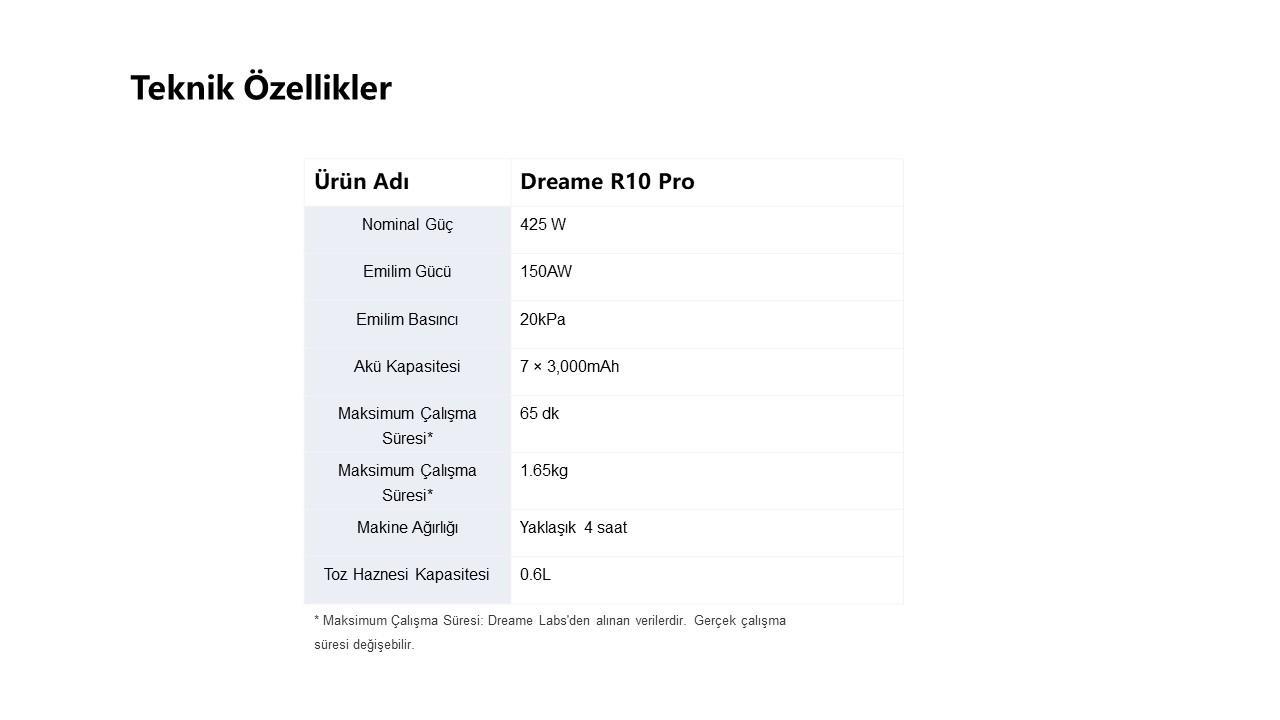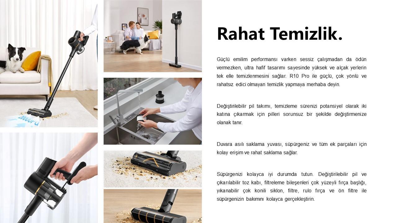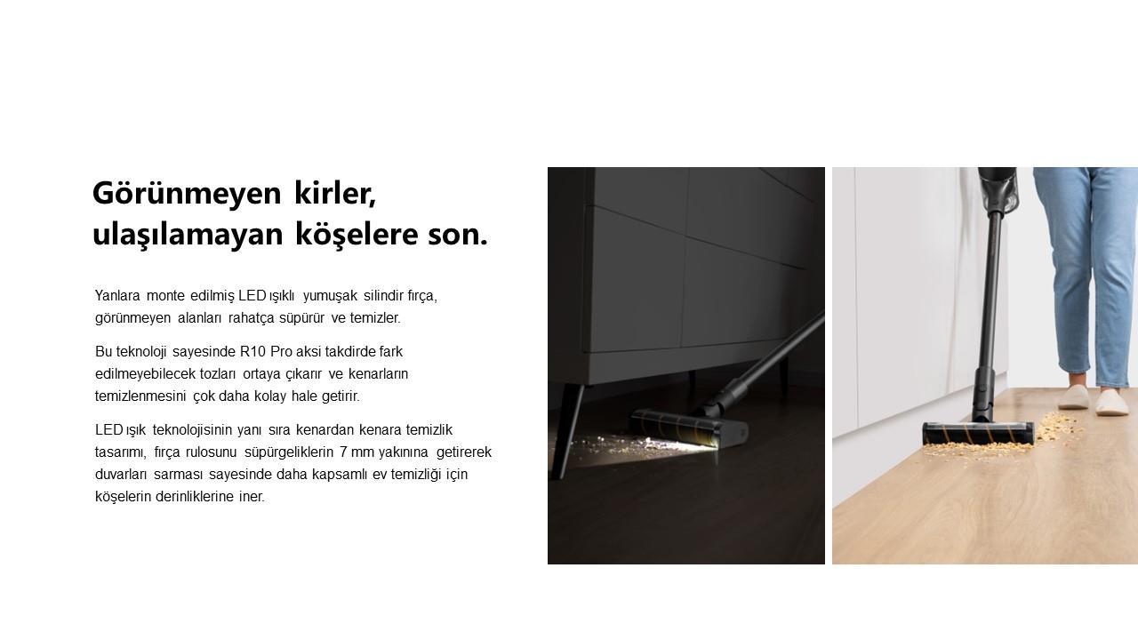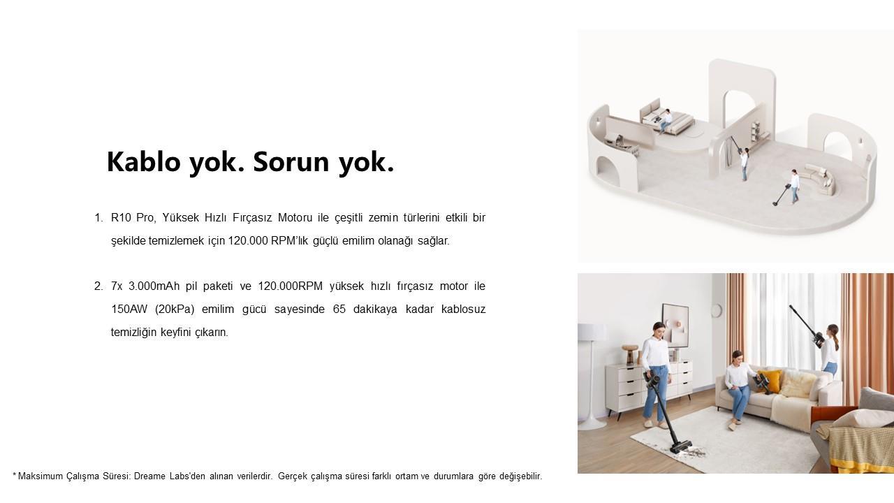 R10 Pro ile 65 dakikaya kadar kablosuz temizlik için güçlü ve kesintisiz emiş gücünü deneyimleyebilirsiniz. 120.000 dev/dk. hıza ve 7x3.000 mAh pil paketine sahip yüksek hızlı, fırçasız motoruyla saç, kir, toz ve kalıntıları etkili bir şekilde çekmek için güçlü emiş gücünü koruyarak evinizde derinlemesine temizlik sağlar.