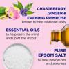 İçeriğinde yer alan Epsom Tuzu, ılık suyla birleştiğinde vücuda ısı ve rahatlama etkisi sunar. Zencefil, hayıt meyvesi (chasteberry) ve akşam sefası (evening primrose) içeren bitkisel kompleks, bedensel konforu desteklerken, doğal esansiyel yağlar ise gevşemeye uygun bir ortam oluşturur.