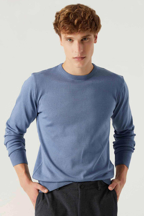 D's Damat Regular Fit Koyu Mavi Tüylenme Yapmayan Bisiklet Yaka Pamuklu Triko Kazak