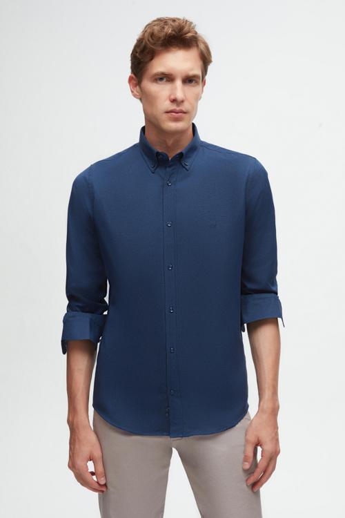 D's Damat Slim Fit Lacivert Oxford Düğmeli Yaka Kolay Ütülenebilir Nakış Detaylı Pamuklu Gömlek