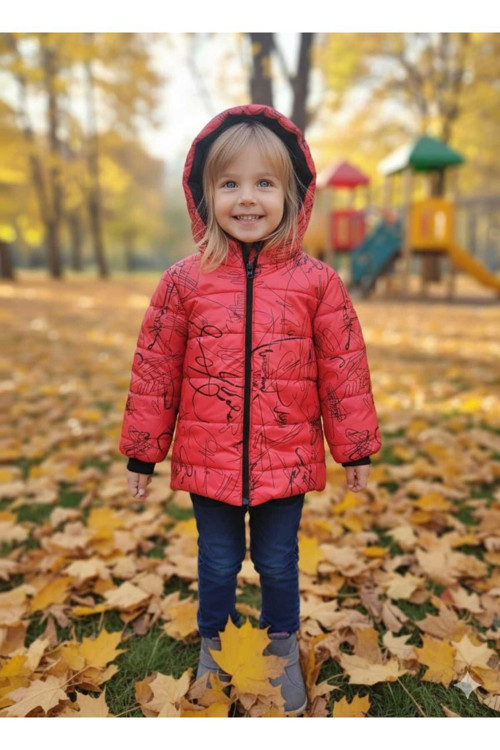 Dublino Kids Kırmızı Ve İmza Desenli İçi Siyah Peluş Astarlı Orta Kalınlıkta Su Ve Rüzgar Geçirmez Çocuk Montu