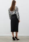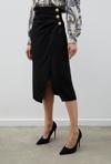 Yüksek bel, arka fermuarlı, kruvaze kesim, süs gold düğmeli, midi saten krep etek.