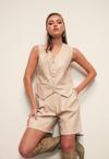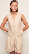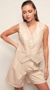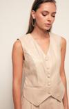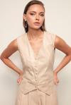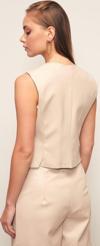 V yaka , kolsuz, astarlı, süs cep, asimetrik kesim, düğme detaylı deri yelek.