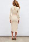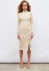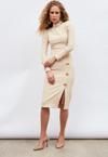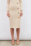 Yüksek bel, arka fermuarlı, astarsız, yırtmaçlı, gold süs düğme detaylı kalem etek.
