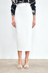 Yüksek bel, yan fermuarlı, arka yırtmaçlı, bel süs düğme detaylı midi etek.